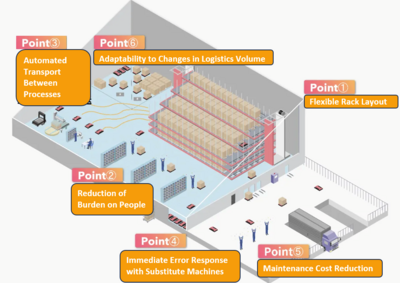 4.Material handling equipment is consolidated into one type of AGV. Even if an error occurs in one unit, other AGVs can be substituted to prevent line stoppage.